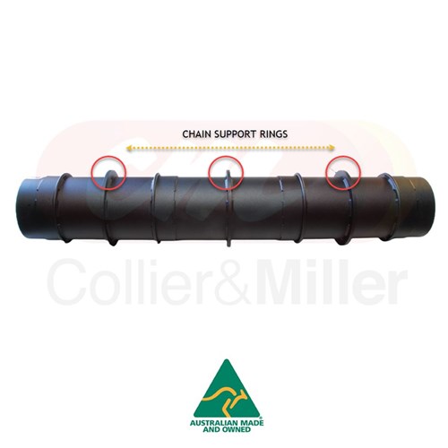 C&M made in Australia aftermarket feeder drum tube (Feeder idle roller) assembly to fit Case-IH® flagship combine harvesters. This drum features welded chain support rings as used on Case-IH® 120, 230 & 240 series combine harvesters with U-bars. On later 240 series and 250 series feeder houses the drum has no chain support rings as the feeder chain bar was upgraded to a heavy cast bar.