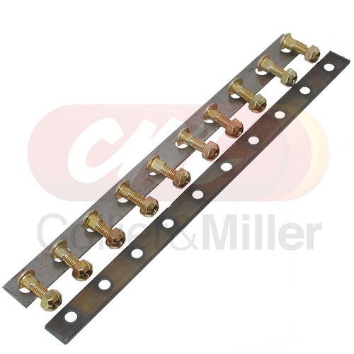 Used to repair a broken cutter bar, this kit contains 2 straps, 10 bolts and 10 lock nuts. The holes are spaced at 1" apart and suit the 4" double cut knife section.