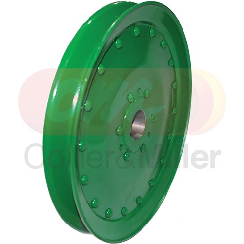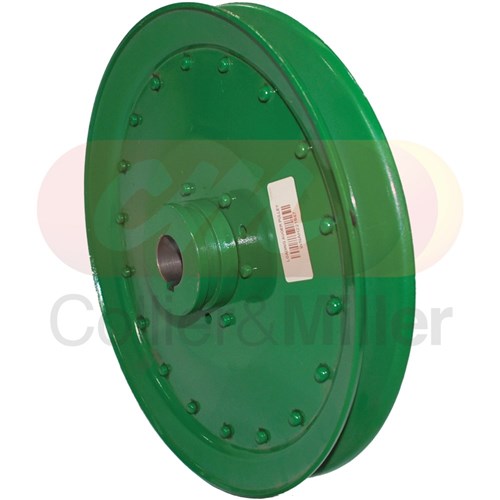 Aftermarket loading auger gearbox pulley to suit John Deere combine harvesters. This Drive pulley measures 11" OD and has a tapered bore and is fixed to the loading auger gearbox. The tapered shaft and keyway provide a positive drive to the gearbox when under load.