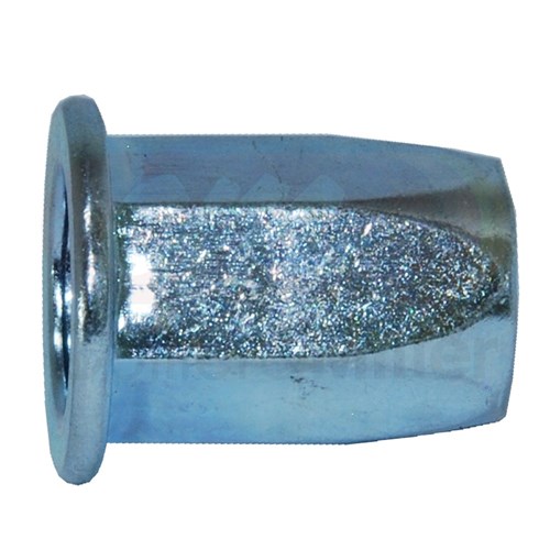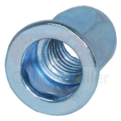 Aftermarket steel rivet nut for fitment to reel tubes on popular models of John Deere header reels. This rivet nut is used where the reel tube must be converted to accept steel tine fingers used during rice harvesting.
