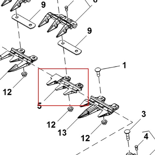 This knife guard is situated on the bottom left hand side of the centre overlap. The raised block on the right hand side of the guard is designed to help prevent plugging and also helps to prevent trash build up on the centre overlap.