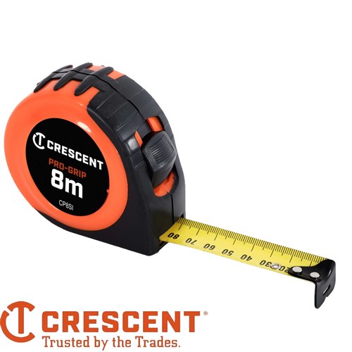 Crescent orange Pro-Grip tape measure comes with a co-moulded case for improved comfort and and grip. 8m x 25mm Yellow blade with black marking.