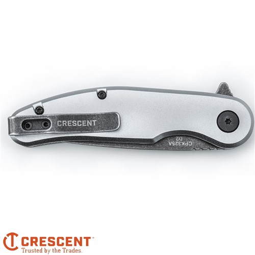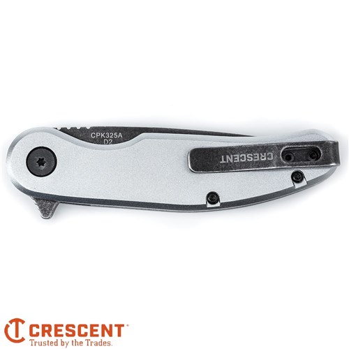 The Crescent CPK325A has a heavy-duty D2 steel drop point blade with a combination of cutting performance, blade strength, easy maintenance, and overall durability that makes it the perfect Every Day Carry. Its gray wash blade finish resists corrosion and provides a striking contrast to its natural anodized aluminum handle, which, in addition to its outstanding strength-to-weight ratio, is ergonomically designed to optimize hand and finger contact points for enhanced fit and superior control. Precision ball-bearing flipper action provides smooth blade deployment, while a full metal core and liner lock design assures secure locking of the blade in the open position and easy closing. A deep pocket carry clip keeps the CPK325A well concealed, yet always accessible.