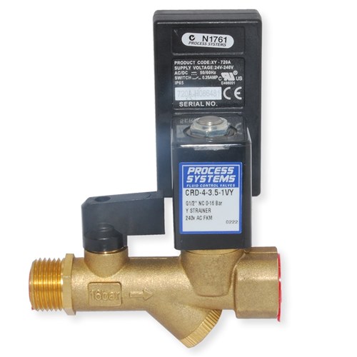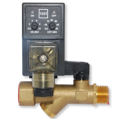 Process Systems Condensate Removal Drain Solenoid Valve (CRD). This condensate removal valve is designed to reduce the risk of human error by providing a regular controlled system of draining, on time, every time, automatically. The analogue timer is programmable from .5 to 10 seconds on and 0 to 45 minutes off. The valve comes standard with isolating ball valve, Y-Strainer for easy cleaning and coil with DIN plug (IP65).