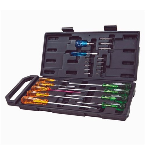 Crescent 25 Piece Screwdriver and bit set. This set features the new Tri-lobe heavy duty cellulose acetate handle design for more comfort and resistance to most solvents & lubricants. Packed in blow-mould case this set contains; Flat Heads, Phillips Heads, Stubby Bit Holders (two way bits), Slotted Precision Bit Holders and Phillips.