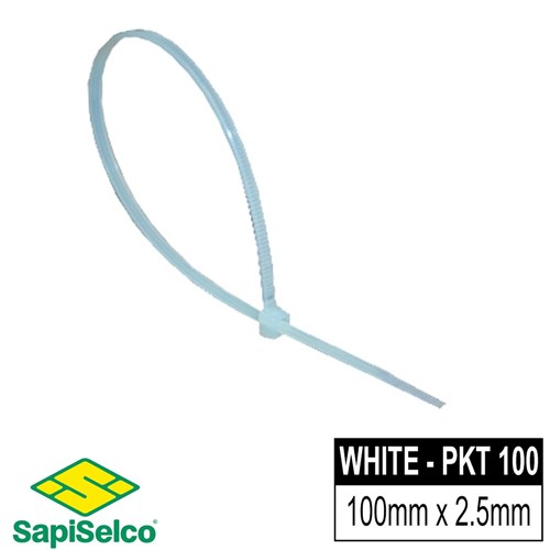 Cable tie white 100mm long by 2.5mm wide. Supplied in a handy bag of 100.