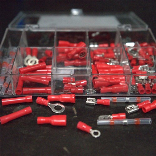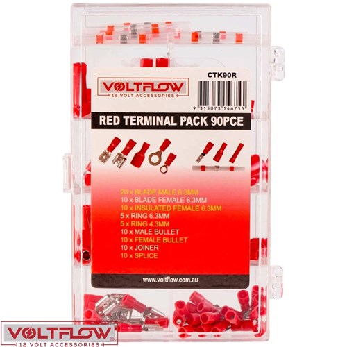 Voltflow's electrical terminal kits provide a wide range of the most commonly used terminals, joiners, and wire splices, all neatly organized in a reusable plastic storage case. Perfect for DIY projects and quick repairs, these kits are available in Blue, Yellow, or Red.