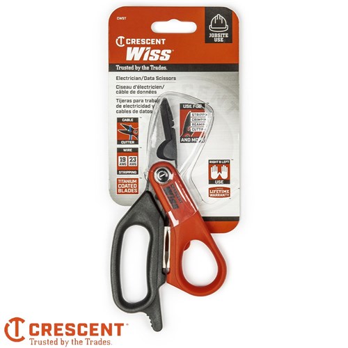 With precision-ground steel blades, these compact Crescent Wiss® Electrician/Data Scissors are perfect for electrical and data cable work. Their titanium blade coating is three times harder than steel for extra durability and a double-serrated bottom blade grips material for better control and cleaner cuts. The scissors incorporate a cable cutter for powerful shear cuts, integrated 19 and 23 AWG wire stripper notches, a “grip zone” feature for tightening wire nuts or crimping low-voltage connections, and serrations on the outside edges for reaming conduit and electrical box knockouts. Touch-point ergonomic handles feature soft textured TPR grips for exceptional comfort and an ergonomic control bar extension provides greater control and increased leverage.