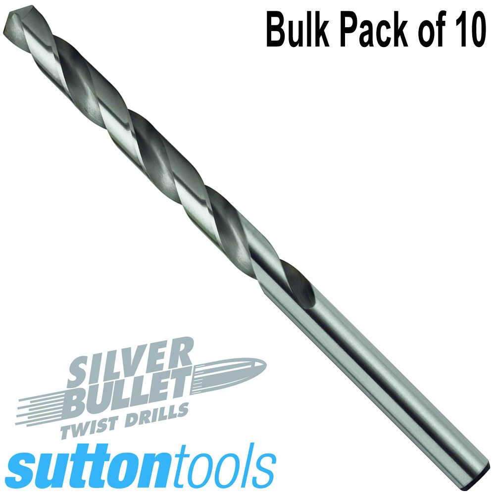 Sutton Tools Jobber Drills Silver Bullet BULK PACK OF 10. The Silver Bullet Twist Drills point design is a 118 Degree Standard Point for accurate hole size and general purpose applications. This general purpose drill bit is made from M2 high speed steel and are designed for machine and hand held drilling in a wide range of ferrous & non-ferrous materials. Contains 10 Pieces of the same size drill bits.