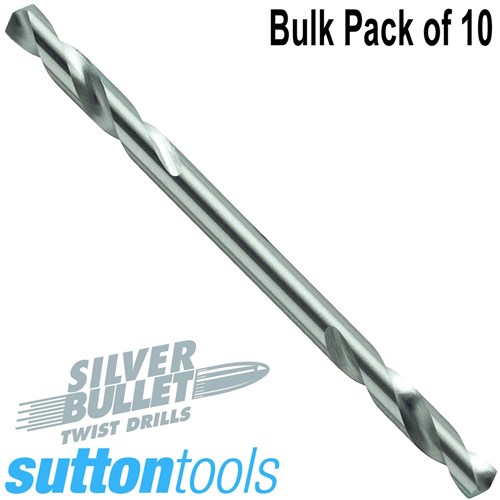 Sutton Tools Panel Drills Double Ended Silver Bullet BULK PACK. Developed to drill holes for rivets in flat and curved panels and used in sheet metal fabrication. The shallow 135 Degree Self Centering point is especially designed to engage with minimal wandering in thin sheet metals. Panel Drill Double Ended tupoint increases drill life. Flute Length designed for shallow hole drilling no deeper than 1.25mm x diameter. Note: Drill holes must be larger than rivet size to allow expansion and reduce metal fatigue. Contains 10 of the same size Panel Drill Bits.