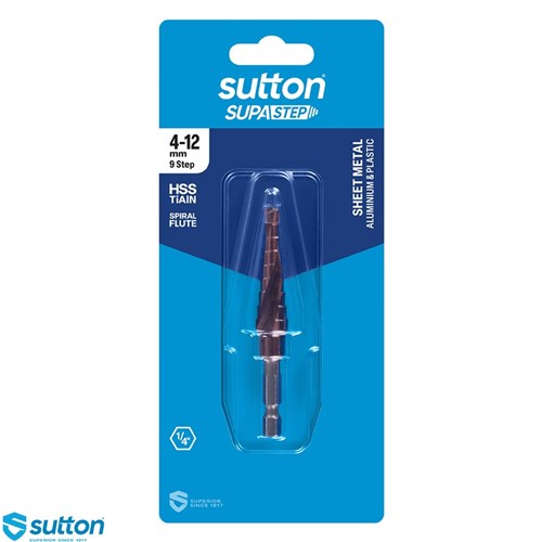 The Sutton SupaStep Step Drill is designed for precision, efficiency, and durability when working with sheet metal, aluminium, plastic, and fibreglass. Perfect for drilling without pre-drilling, each step automatically deburrs the previous hole for a smooth, clean finish. Constructed from high-speed steel and enhanced with a Futura Nano coating for superior wear resistance, this drill delivers exceptional performance and long service life. Its spiral flute design minimises vibration and ensures greater control, while the 1/4" hex shank makes it compatible with both impact drivers and drills.