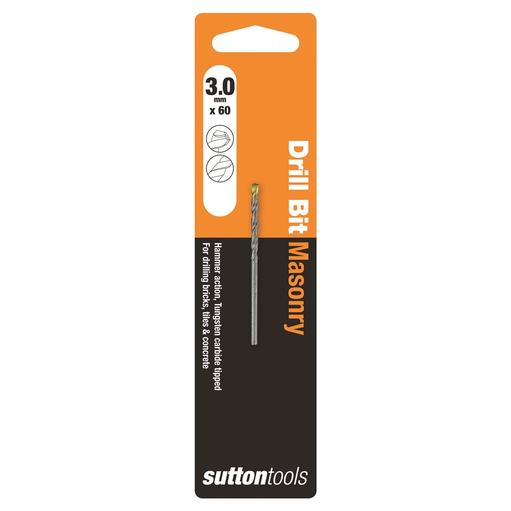 Sutton Tools Masonry Drills Standard Fixing. These tradesman quality drill bits are ideal for use in use in natural and artificial stone, masonry, brick work and concrete. Features a TCT point two cutting edged carbide percussion tip with a semi positive profile for aggressive drilling in hard materials and a double spiral flute which provides greater dust extraction, extending drill life.