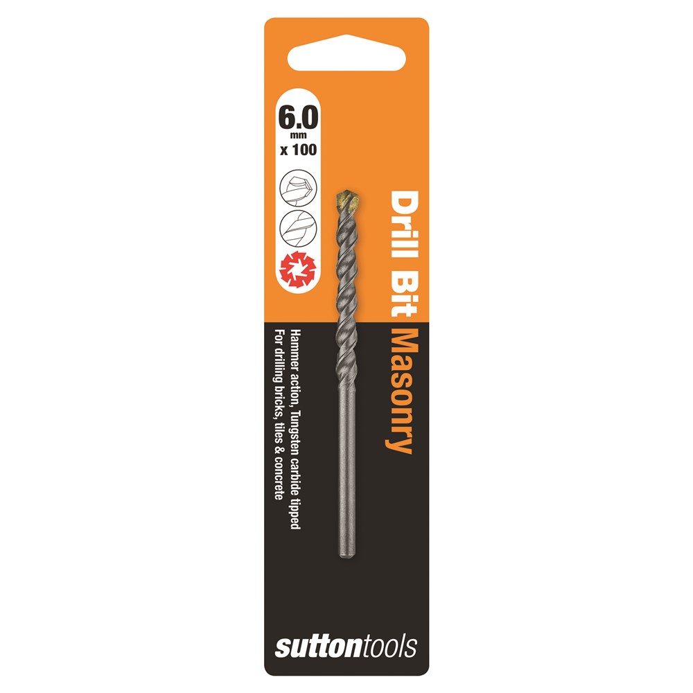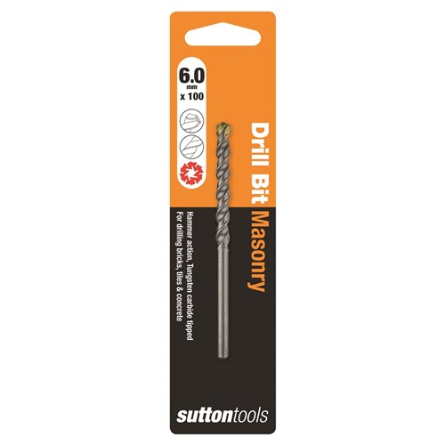 Sutton Tools Masonry Drills Standard Fixing. These tradesman quality drill bits are ideal for use in use in natural and artificial stone, masonry, brick work and concrete. Features a TCT point two cutting edged carbide percussion tip with a semi positive profile for aggressive drilling in hard materials and a double spiral flute which provides greater dust extraction, extending drill life.