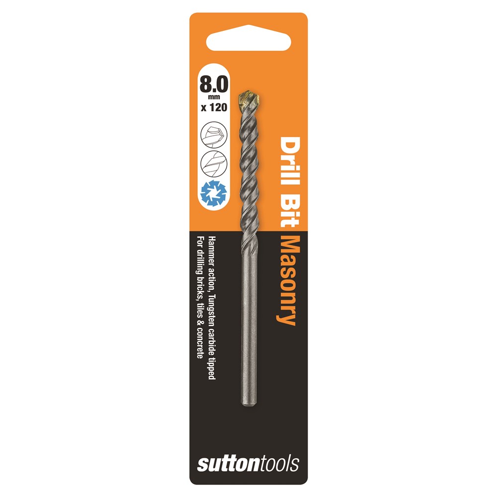 Sutton Tools Masonry Drills Standard Fixing. These tradesman quality drill bits are ideal for use in use in natural and artificial stone, masonry, brick work and concrete. Features a TCT point two cutting edged carbide percussion tip with a semi positive profile for aggressive drilling in hard materials and a double spiral flute which provides greater dust extraction, extending drill life.