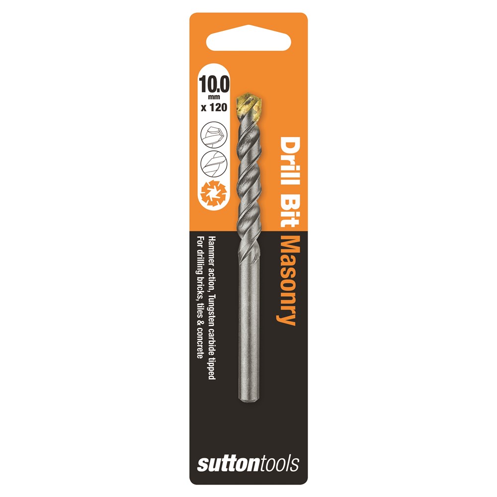 Sutton Tools Masonry Drills Standard Fixing. These tradesman quality drill bits are ideal for use in use in natural and artificial stone, masonry, brick work and concrete. Features a TCT point two cutting edged carbide percussion tip with a semi positive profile for aggressive drilling in hard materials and a double spiral flute which provides greater dust extraction, extending drill life.