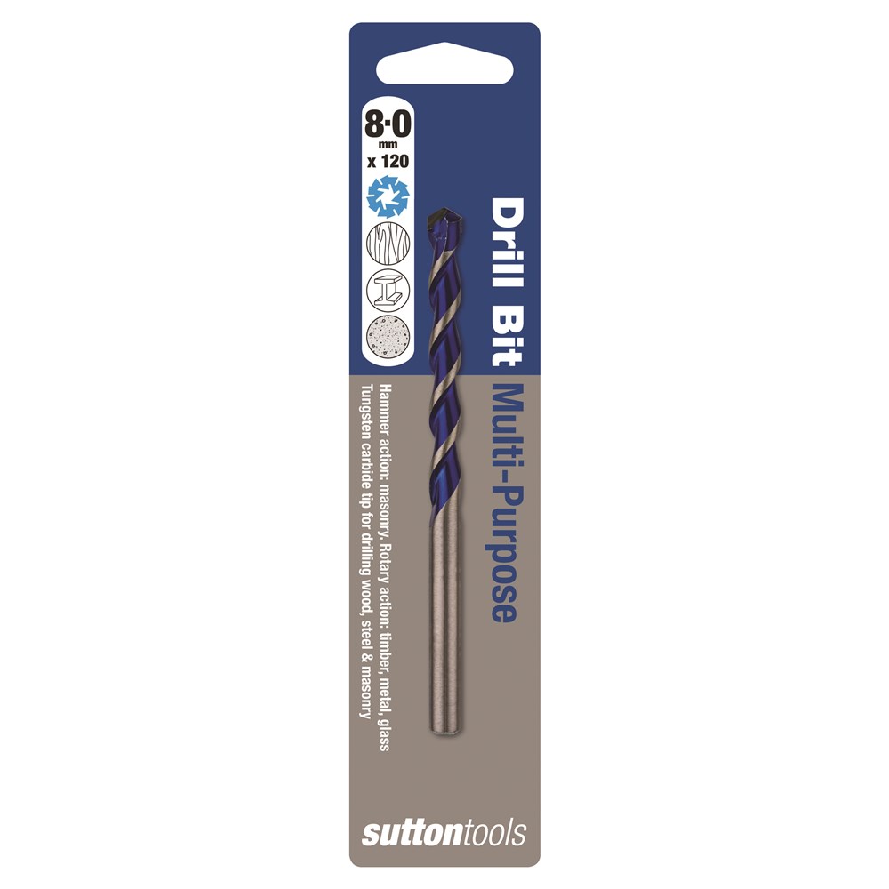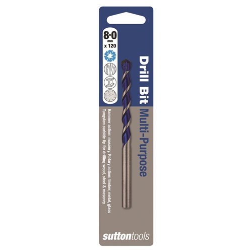 Sutton Tools Multi-Purpose Drills, Standard Length. For drilling in various materials such as timber, concrete, brick, stainless steel, cast iron, steel & glass. Especially suited for drilling multi laminated construction materials. Features a TCT Point ground carbide tip with two cutting edges and a L-profile flute design which efficiently extracts concrete, metal & wood particles. Hammer Action: For masonry materials only. Rotary Action: For all other materials.