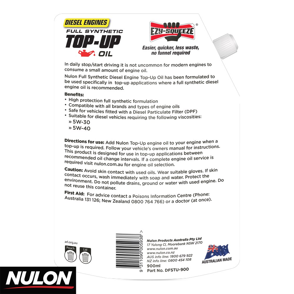 Nulon Full Synthetic Diesel Engine Top-Up Oil 900ml – Safe to Mix (5W-30 / 5W-40)