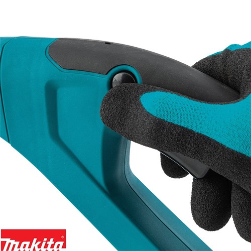 The simple lever lock allows the shaft to be extended to provide a comfortable position for a wide range of heights, and the position of the front handle can be adjusted to further suit different users. The lever lock also allows the shaft to be rotated 180 degrees, to allow the head to cut in a vertical position without the user changing their hand position.