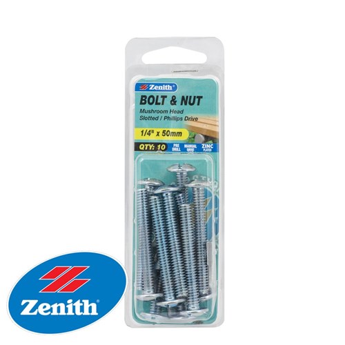 Zinc plated mushroom head slotted machine screws & nuts supplied in a convenient handi-pack