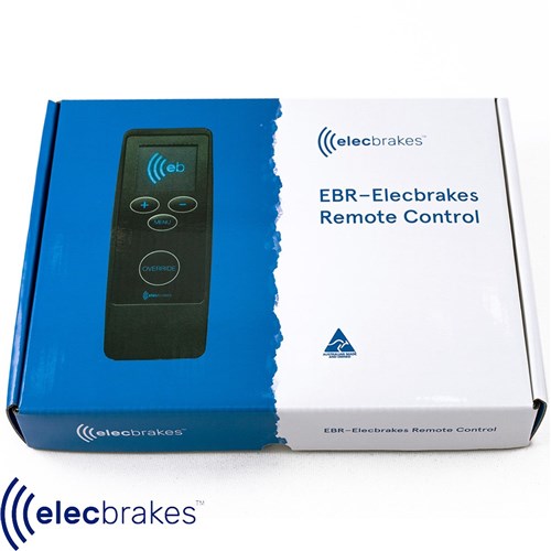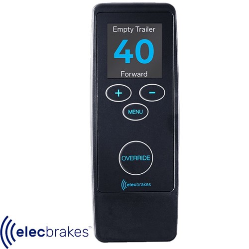 The in-car remote control for Elecbrakes enables users to manage brake response, choose custom programs, and engage trailer brakes exclusively through the manual override button, ensuring adherence to ADR38/04 regulations.