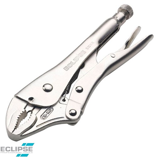Eclipse 250mm Curved Jaw Locking Pliers. Features high grade chrome molybdenum steel body & jaws. Long straight jaws for access to confined spaces & gripping small objects. Wear resistant serrated & hardened jaws for firm grip . Guarded release trigger - Screw Adjustable. Use for welding, automotive, plumbing, electrical & woodworking use.