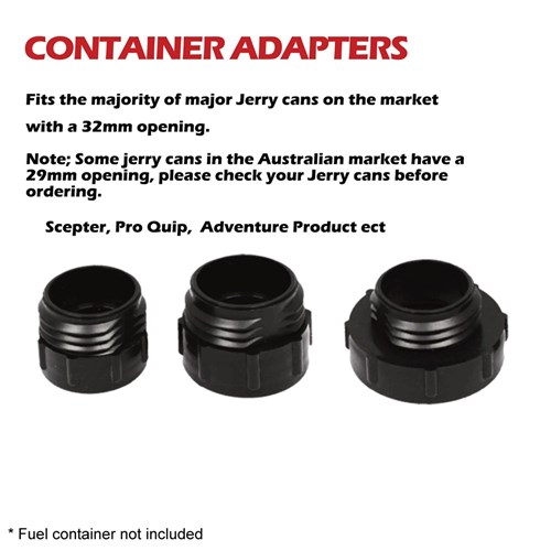 - Note minimum container opening required is 32mm. We suggest checking your jerry can opening before ordering.