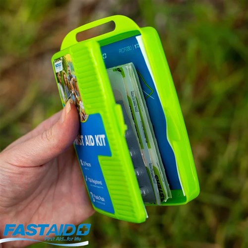 - Includes adhesive plasters, wound wipes, splinter probes, and CPR face shield