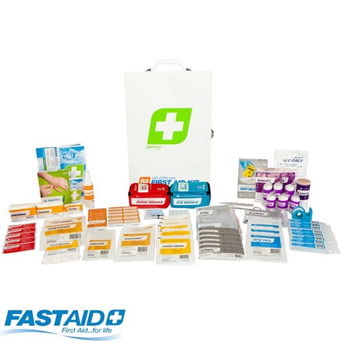 Featuring a comprehensive selection of premium hospital-grade contents, the FastAid R2 Industra Max™ kit includes two additional modules dedicated to treating burn and eye injuries. It comes equipped with extras like hydrogel burn gels and dressings, complemented by comprehensive treatment guides for effective burns management.