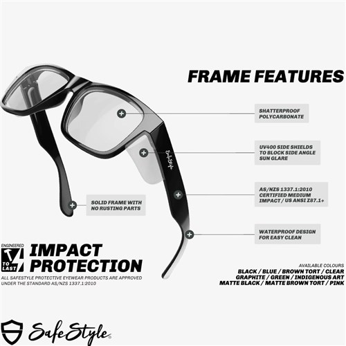 SafeStyle’s clear lenses provide ideal optical clarity for indoor use, delivering 100% consistent vision across the entire lens, so you get a natural view while keeping your eyes safe from harmful UV rays. Made from fully recyclable, UV400-rated shatterproof polycarbonate, these lenses block 99.9% of UVA and UVB rays and feature a super-hard anti-scratch coating for lasting durability.