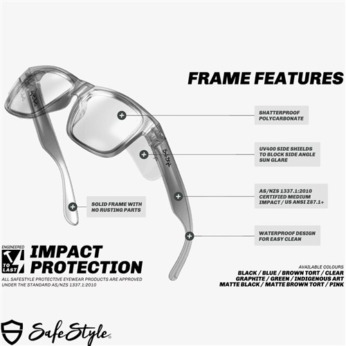 - Certified to AS/NZS 1337.1:2010 and ANSI Z87.1+