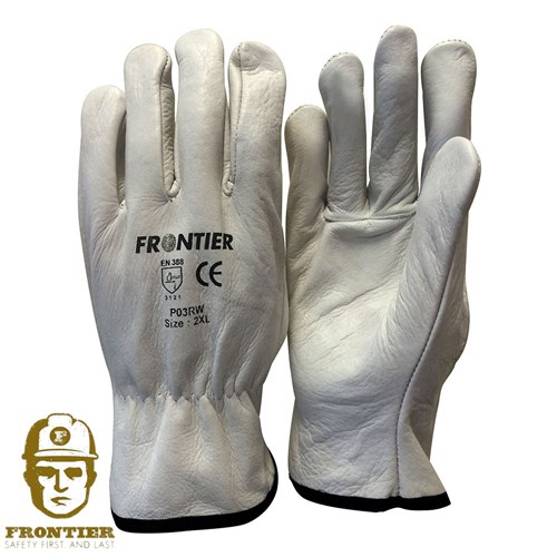 Frontier Cowgrain Leather Riggers Glove. These gloves feature A Grade beige cow grain, in sewn elastic, Level 2 Cut Protection and a wing thumb which allows better open hand pulling and grabbing. They are 250mm Long. For use in applications such as general purpose use, construction, mining, rigging and landscaping.