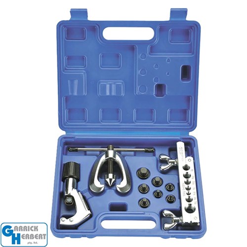 Precision-made for professional brake and fuel line work, the Garrick Herbert Double Flaring Tool Kit delivers clean, consistent 45° single or double flares every time. With a wide range of attachments and a durable tube cutter, this all-in-one kit suits most common tubing sizes, making it ideal for automotive and industrial use. Packed in a tough blow mould case for protection and portability.
