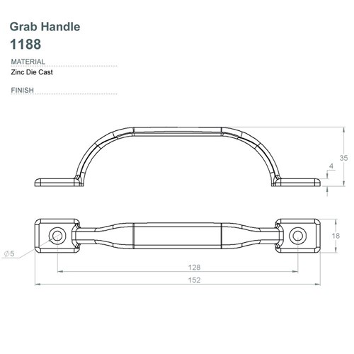 Die cast aluminium grab handle. Finished with a chrome plating and secured with 2 x 5mm fixing holes.