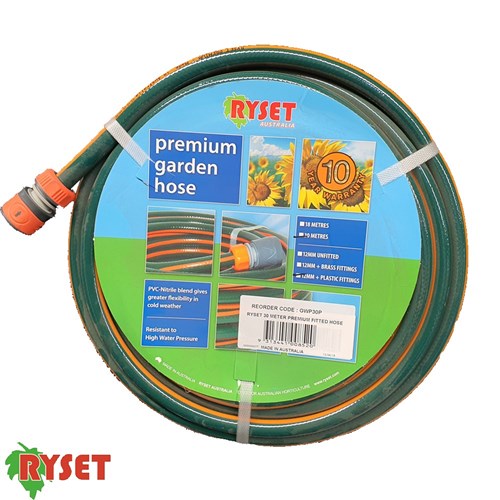 Ryset Premium Fitted Hose, 12mm x 30 meters, Green. Made from heavy duty Australian made re-enforced PVC/ Nitrite rubber alloy which gives superior flexibility in all weather conditions. Heavy Duty 3mm wall thickness, Anti Kink.