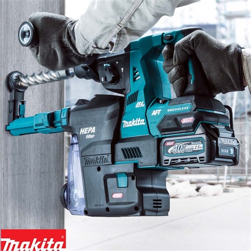 Experience powerful and precise drilling with the Makita 40V Max Brushless 28mm Rotary Hammer, designed for heavy-duty performance. Delivering 2.8 joules of impact force, this tool makes quick work of tough materials. The advanced Anti-Vibration Technology (AVT) minimizes vibration to just 7.0m/s², ensuring comfort during extended use. Equipped with Active Feedback sensors, it automatically shuts down the tool in the event of a kickback, enhancing user safety. This model is compatible with AWS for seamless wireless connectivity with compatible dust extraction systems, and offers versatile dust management options for various environments. For optimal dust control, it is also compatible with the DX12 optional dust extractor.