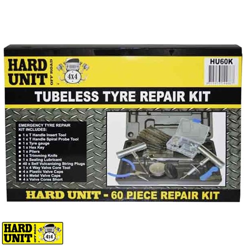 The Hard Unit 60pc tyre repair kit is ideal for fixing punctures in tubeless tyres. Complete with all tools required to fix your puncture and get you back on the road in no time. This kit can also be used for repairs to buggies, wheelbarrows, go carts and more.