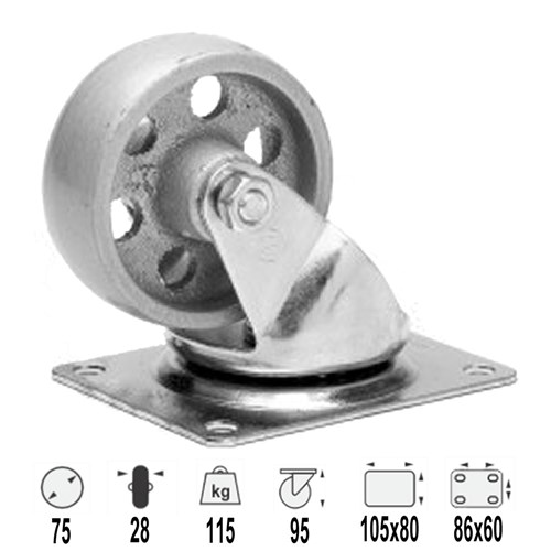 Industrial castor suitable for loads up to 115kg. This castor is a zinc plated unit and features a bearing mounted Cast Iron wheel that is hard wearing and has non-marking properties. This is a swivel castor.