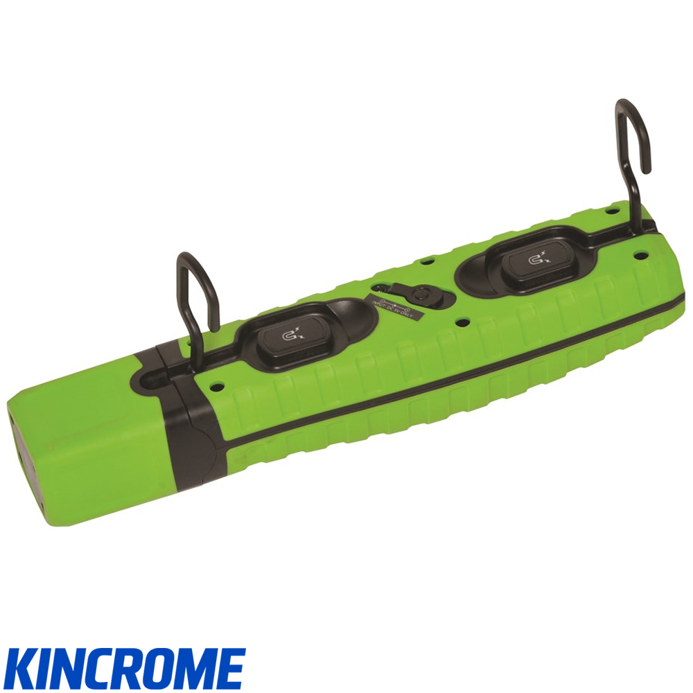 Kincrome LED Li-Ion Work light Green. Features a tough durable "Hi-Vis" green case and comes with state of the art SMD (Surface Mount Diodes) LED technology, giving a maximum 400 Lumens providing 120 Degrees of light spread. Plastic coated magnets on the back and the base, hooks and a unique 360 Degrees ball-joint allow almost unlimited mounting options. The three stage switch allows the user to choose between maximum brightness (400 Lumens), half brightness (200 Lumens), or a torch located at the top of the unit.