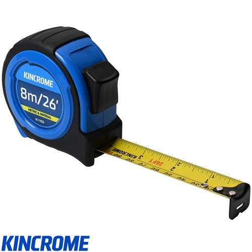 The Kincrome 8m/26' Tape Measure features durability and functionality needed by professionals in all trades. Features include a Nylon metric/imperial blade, TPR mould for easy handling and a belt clip for easy access & storage.
