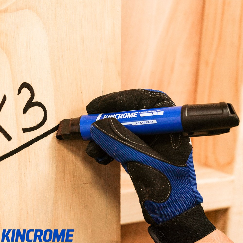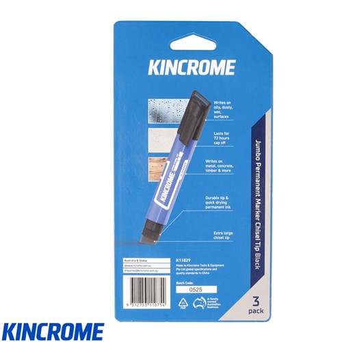 The Kincrome Jumbo Permanent Marker 3-Pack (Part No. K11829) delivers durable, reliable performance across tough jobsite conditions. Featuring an extra-large chisel tip and quick-drying permanent ink, these markers write clearly on metal, timber, concrete, and even oily, dusty, or wet surfaces. Ideal for automotive, construction, and industrial applications, Kincrome markers offer professional-grade quality you can trust.