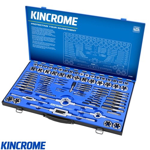 Manufactured from Alloy Steel with HRC 58-62. Contents includes 2 Die Handles (1" & 1.5), 2 Tap Adjustable Tap Wrenches (1/8-1/2", 1/4-3/4"), 5 Drill Bits: 2.5MM, 3.3MM, 4.2MM, 5.0MM, 6.8MM, 5 X Screw Extractors: No.1 No.2 No.3 No.4 No.5, 35 Die Sizes (10NC, 10NF, 1/4NF, 1/4NF, 5/16NC, 5/16NF, 5/8NC, 3/8NC, 3/8NF, 1/8NPT, 7/16NC, 7/16NF, 1/2NC, 1/2NF, 1/2BSW, M3X0.5, M4X0.7, M5X0.8, M6X1.0, M8X1.0, M8X1.25, M10X1.0, M10X1.25, M10X1.5, M12X1.25, M12X1.5, M12X1.75, M14X1.25, M14X1.5, M14X2.0, M16X1.5, M16X2.0, M18X1.5, M20X2.5) and 35 die sizes (3/8NC, 3/8NF, 7/16NC, 7/16NF, 1/2NC, 1/2NF, 1/2BSW, 5/16NC, 5/16NC, 5/16NF, 1/4NC, 1/4NF, 10NC, 10NF, 1/8NPT, M10, M10*1.25, M3X0.5, M4X0.7, M5X0.8, M6X1.0, M8X1.0, M10X1.0, M10X1.25, M10X1.5, M12X1.25, M12X1.5, M12X1.75, M14X1.25, M14X1.5, M14X2.0, M16X1.5, M16X2.0, M18X1.25, M18X1.5, M20X2.5)