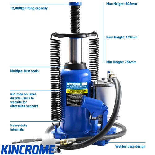 Kincrome Bottle Jacks are built with high-quality seals, materials, and design to ensure they can stand up to professional use. They are ideal for automotive and truck repair/maintenance, suitable for both workshop and roadside use, and can be used with a standard truck air or portable compressor.