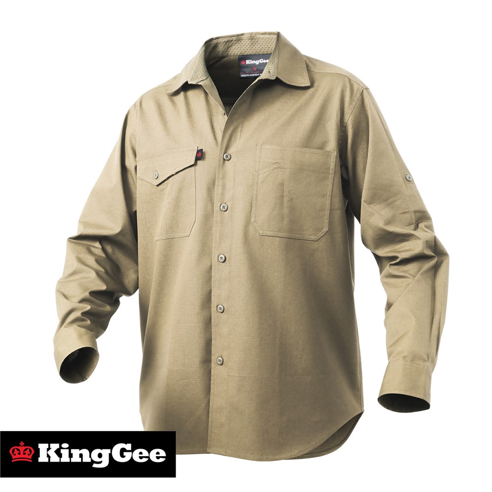 King Gee Khaki WORKCOOL 2 Long Sleeve open front cotton shirt. Made with lightweight breathable fabric - cooler and stronger. Secured chest pocket on the right hand side and open pocket with pen partition on the right hand side.