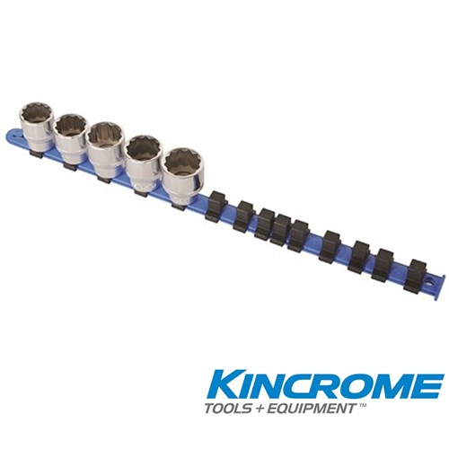 Socket rail storage system for 1/2" drive for 14 x 1/4" drive sockets. Clips include a Ball Bearing style latching system, similar to a Quick Release ratchet to secure the socket & reduce wear. Clips are removable, so the rail can be customized to suit the user. Sockets not included