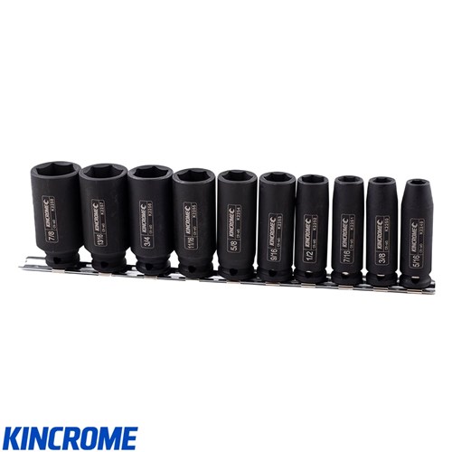 The Kincrome 10 Piece Impact Socket Rail 3/8" Drive (Imperial) is built for strength and durability, crafted from premium Molybdenum (Cr-Mo) Steel to handle high-torque applications. This set includes deep imperial sizes from 5/16" to 7/8" and is organized on a Clip Rail for easy access. Perfect for professionals and DIYers, these tough impact sockets ensure long-lasting performance and come with Kincrome’s Lifetime Warranty.