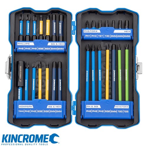 Kincrome's Impact Bit Set 28 Piece features Torsion Control, Magnetic Precision Tip, Impact Performance and Magnetic Extreme C-Clip Coupler.
