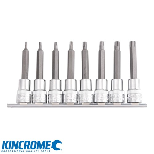 Kincrome's Tamperproof Torx Socket Set 8 Piece 1/2" Drive is manufactrued from heavy duty Chrome Vanadium Steel and includes sizes 100mm: T20H, T25H, T27H, T30H, T40H, T45H, T50H, T55H. Sockets are supplied on a clip rail for your convenience.