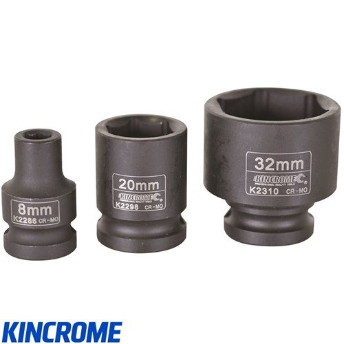 Kincrome 1/2" square drive impact socket.Manufactured from Chrome Molybdenum Steel (Cr-Mo), hardened and tempered to perform in extreme conditions. Designed to be used with Pneumatic and Power tools where higher torque and force is required. Kincrome Impact Sockets and Accessories meet and exceed the following international standards - ANSI, DIN 3121 & 3129.