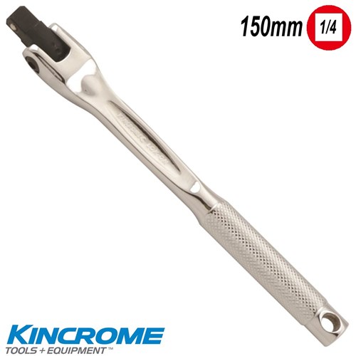 Kincrome LOK ON 1/4" Flex Handle, 150mm (6") Long. This LOK ON Flex Handle features a hinged joint head with 6 positive stop positions, a spring loaded ball bearing which holds the socket securely and a knurled handle for extra grip. Manufactured from Chrome Vanadium Steel (CrV), hardened and tempered with a chrome plated mirror polished finish for corrosion protection.