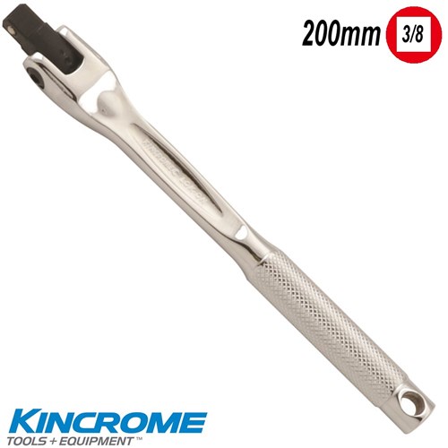 Kincrome LOK ON 3/8" Flex Handle, 200mm (8") Long. This LOK ON Flex Handle features a hinged joint head with 6 positive stop positions, a spring loaded ball bearing which holds the socket securely and a knurled handle for extra grip. Manufactured from Chrome Vanadium Steel (CrV), hardened and tempered with a chrome plated mirror polished finish for corrosion protection.